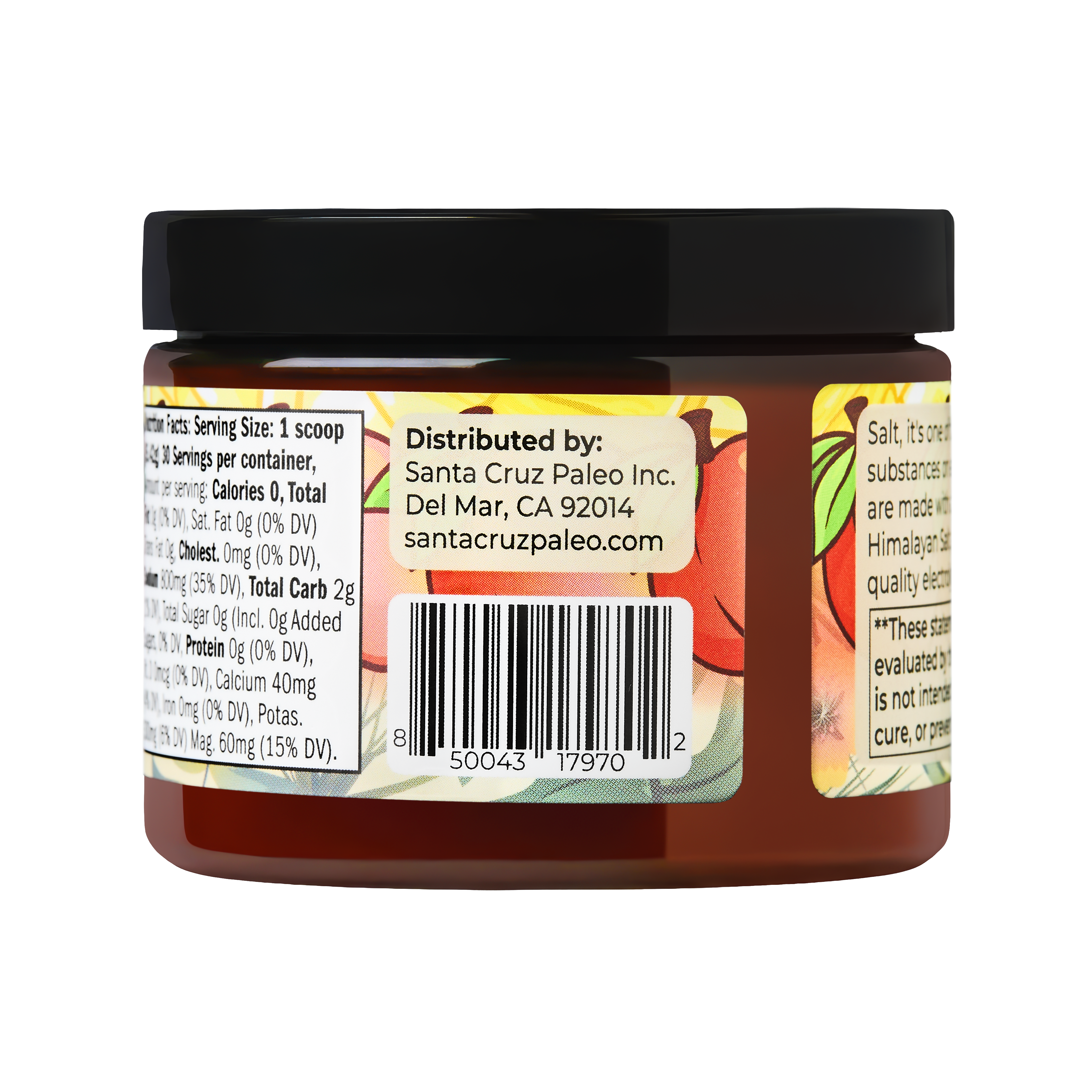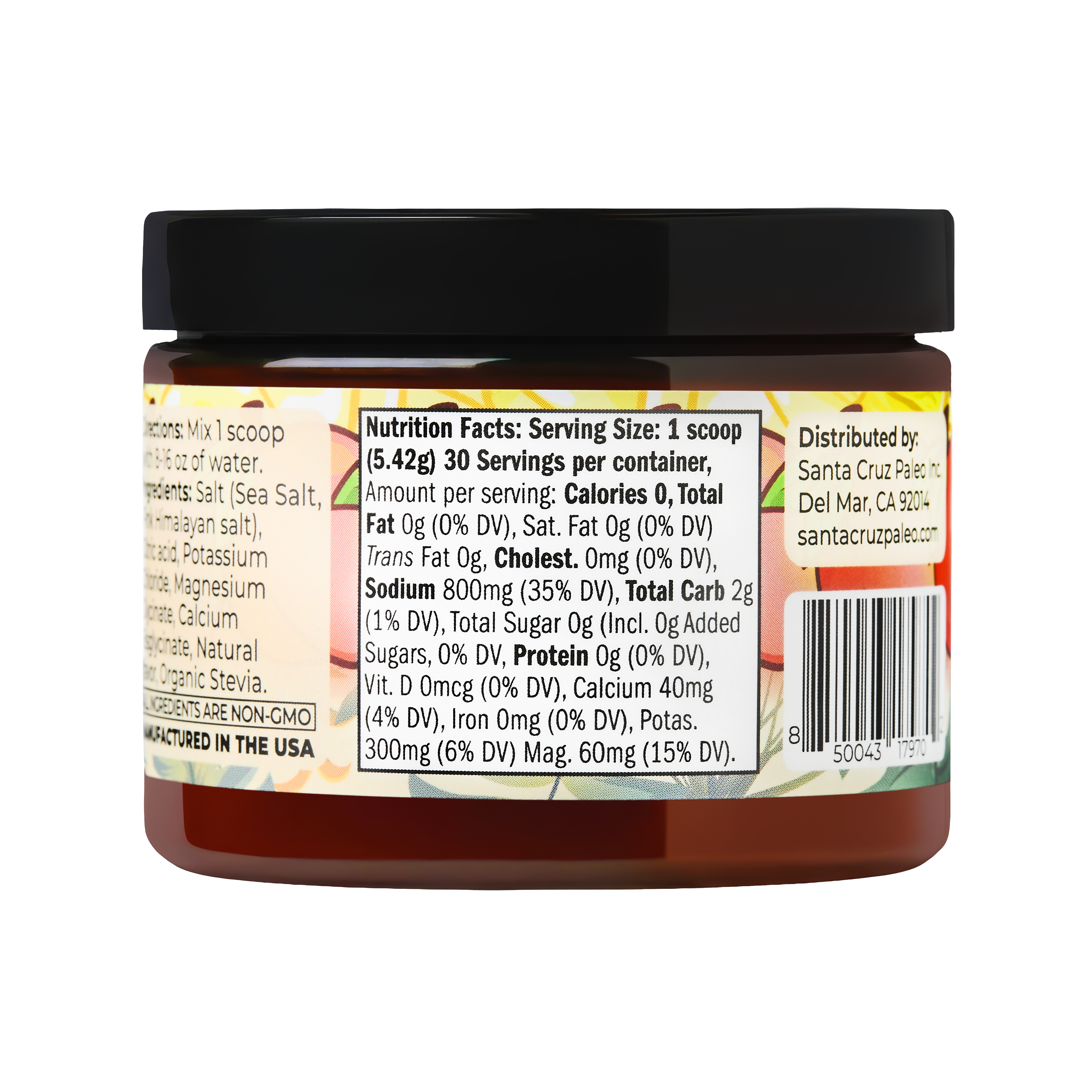INGREDIENTS: Salt (Sea Salt, Himalayan Pink Salt), Citric Acid, Potassium Chloride, Magnesium Glycinate, Calcium Bisglycinate, Natural Flavor, Organic Stevia.