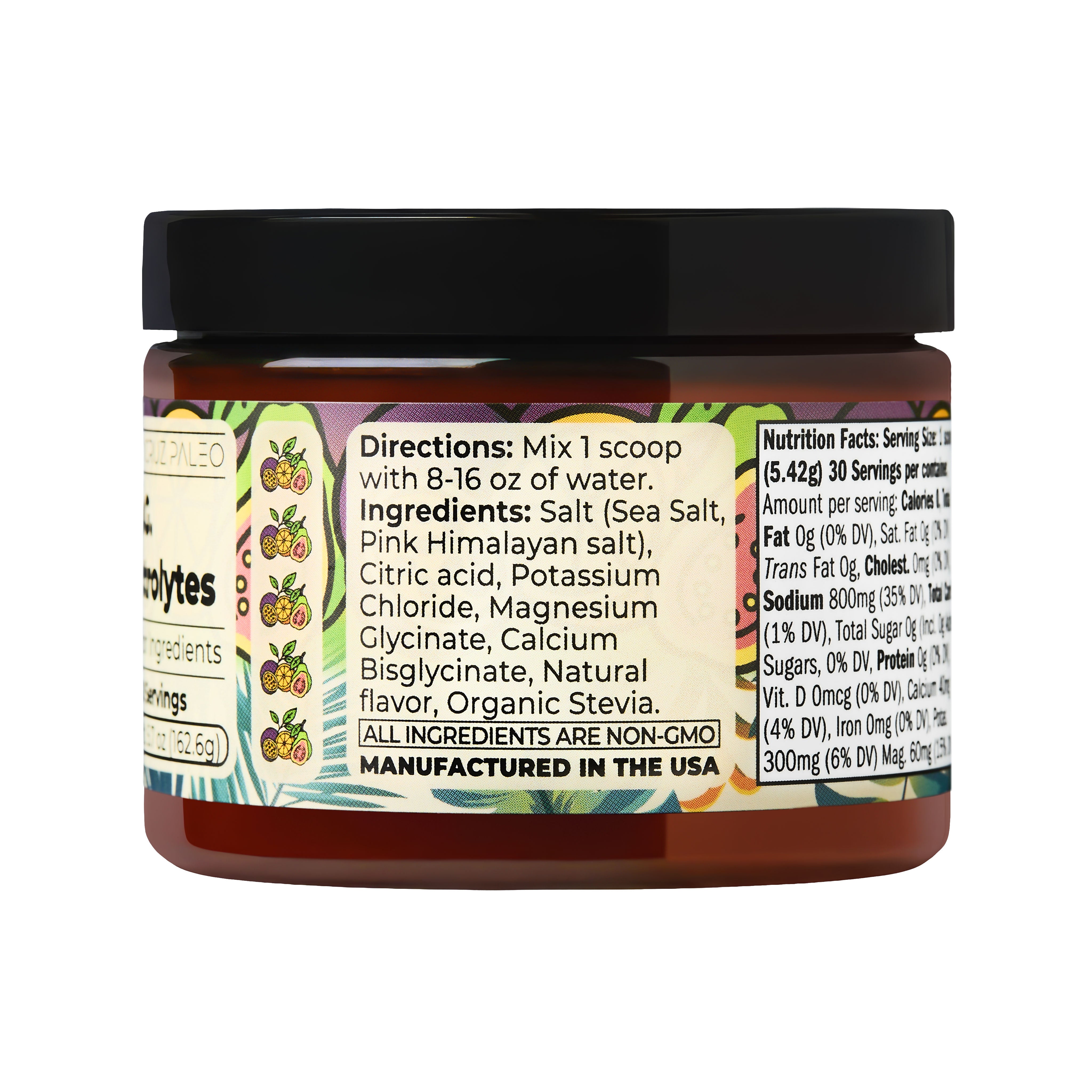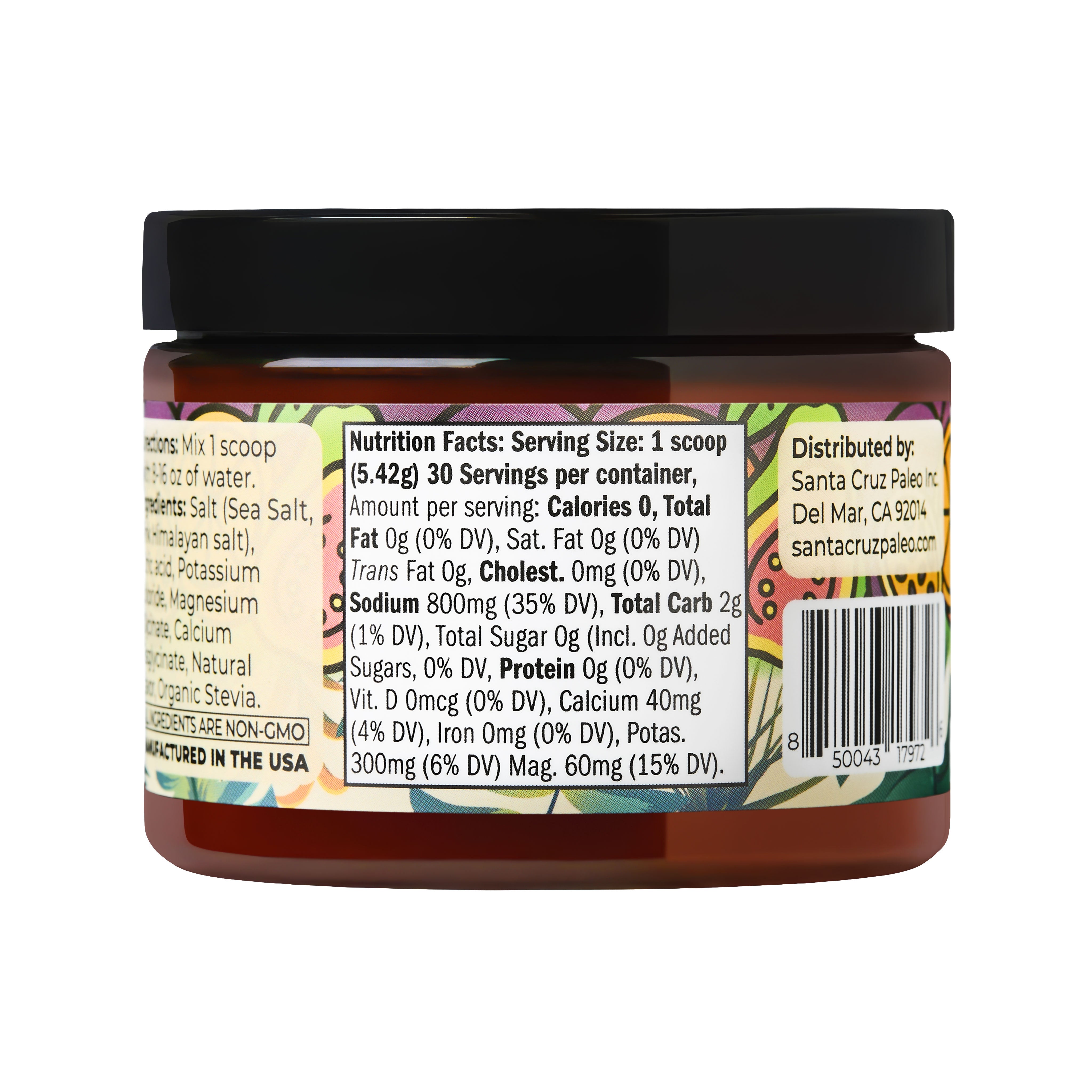 INGREDIENTS: Salt (Sea Salt, Himalayan Pink Salt), Citric Acid, Potassium Chloride, Magnesium Glycinate, Calcium Bisglycinate, Natural Flavor, Organic Stevia.